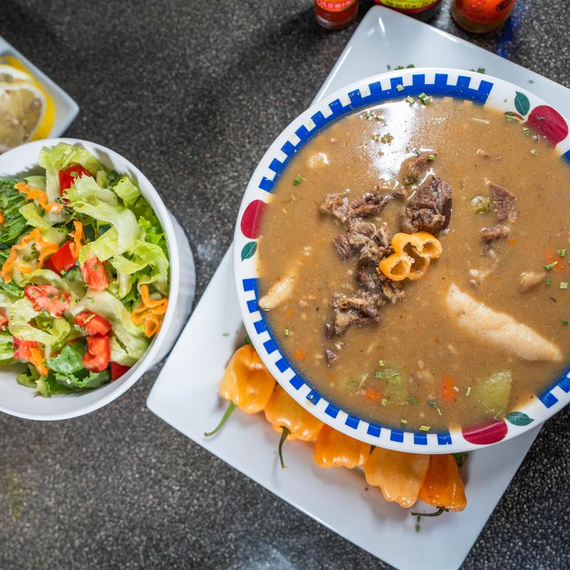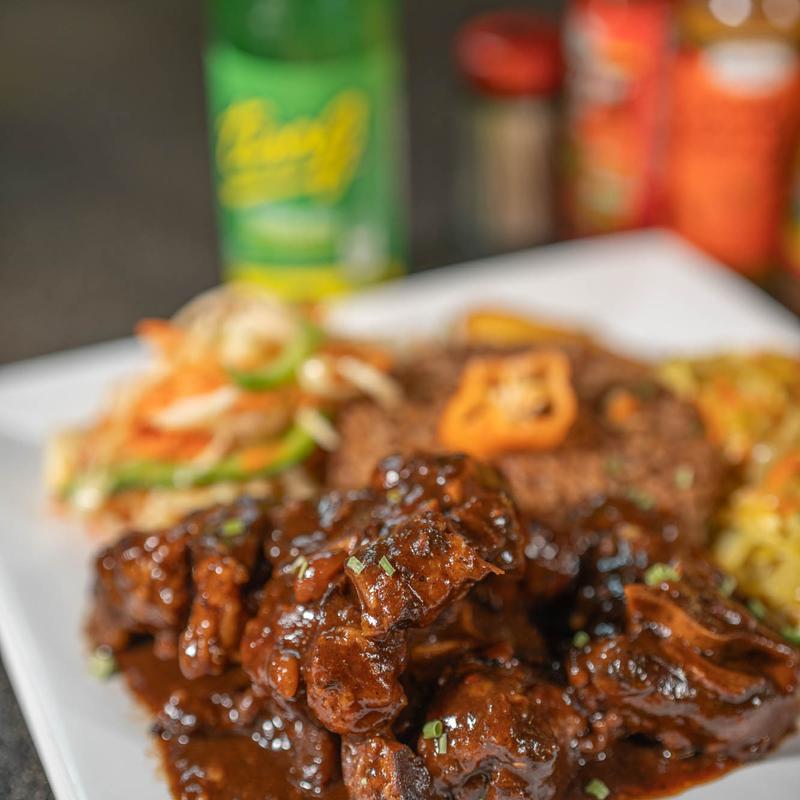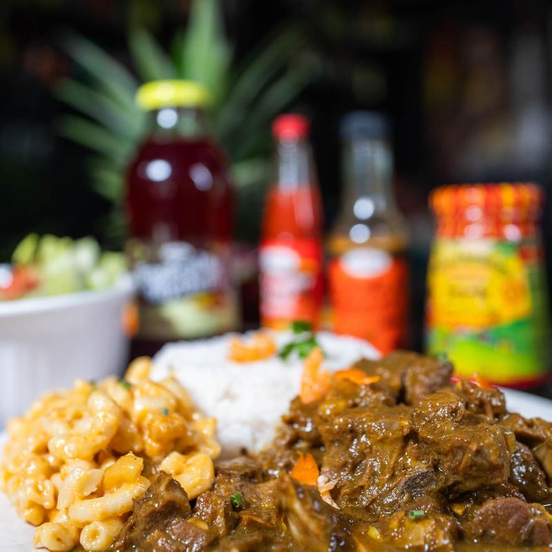 Oxtails, Curry Goat & Choose Two Sides: Steamed White Rice, Rice & Peas, Steamed Cabbage, Sweet Fried Plantain, or Baked Mac & Cheese