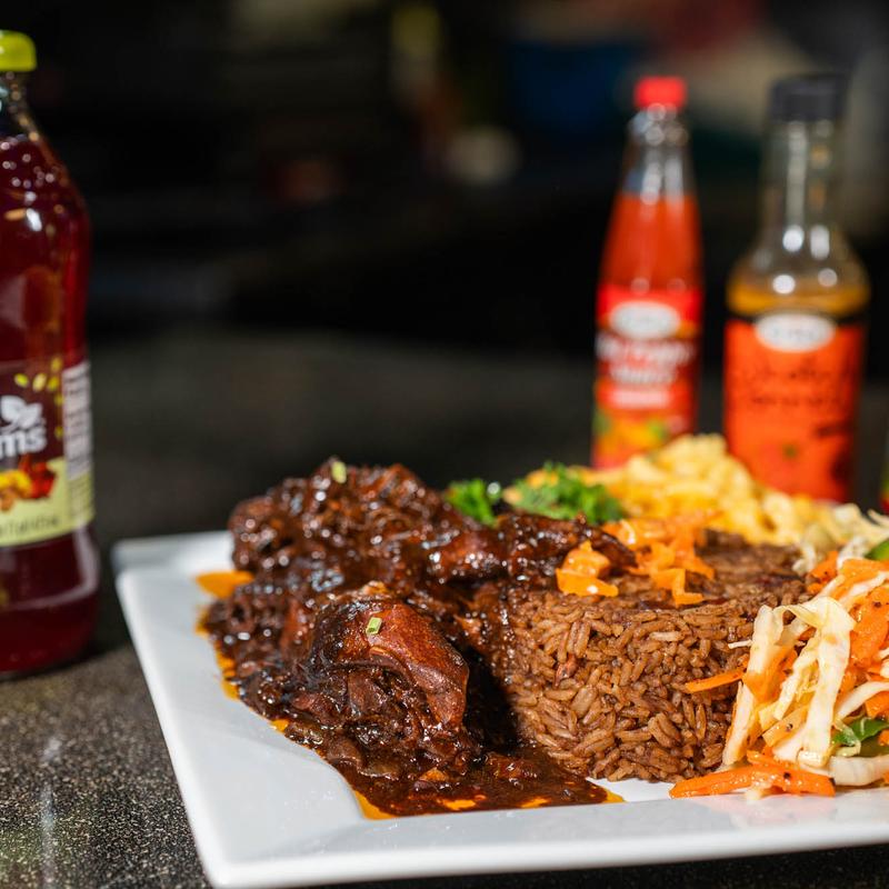Oxtails (Qty. 3) & Choose Two Sides: Steamed White Rice, Rice & Peas, Steamed Cabbage, Sweet Fried Plantain, or Baked Mac & Cheese