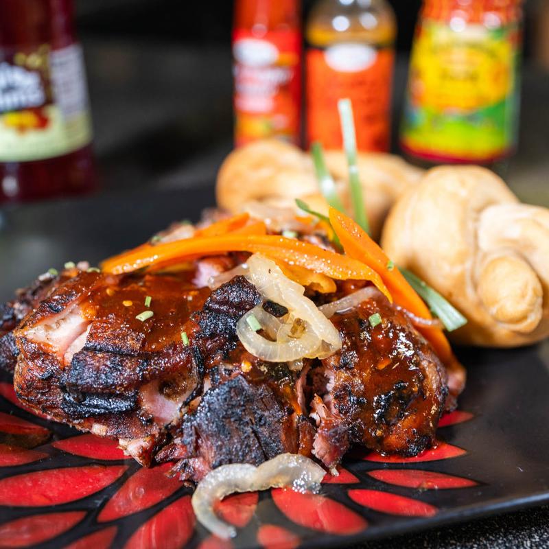 Jerk Pork Pieces & Choose Two Sides: Steamed White Rice, Rice & Peas, Steamed Cabbage, Sweet Fried Plantain, or Baked Mac & Cheese