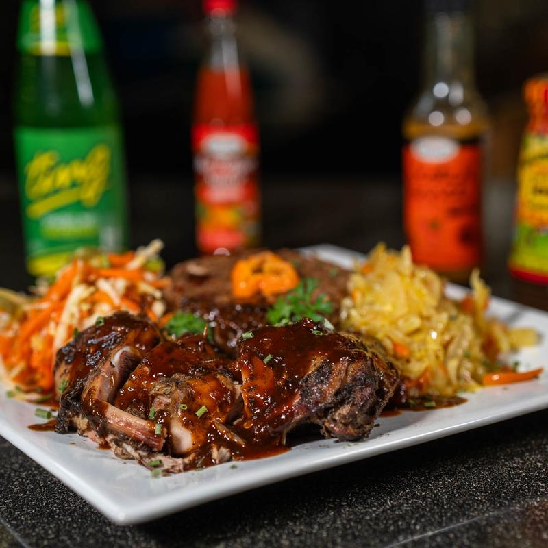 Oxtails, Jerk Wings & Choose Two Sides: Steamed White Rice, Rice & Peas, Steamed Cabbage, Sweet Fried Plantain, or Baked Mac & Cheese