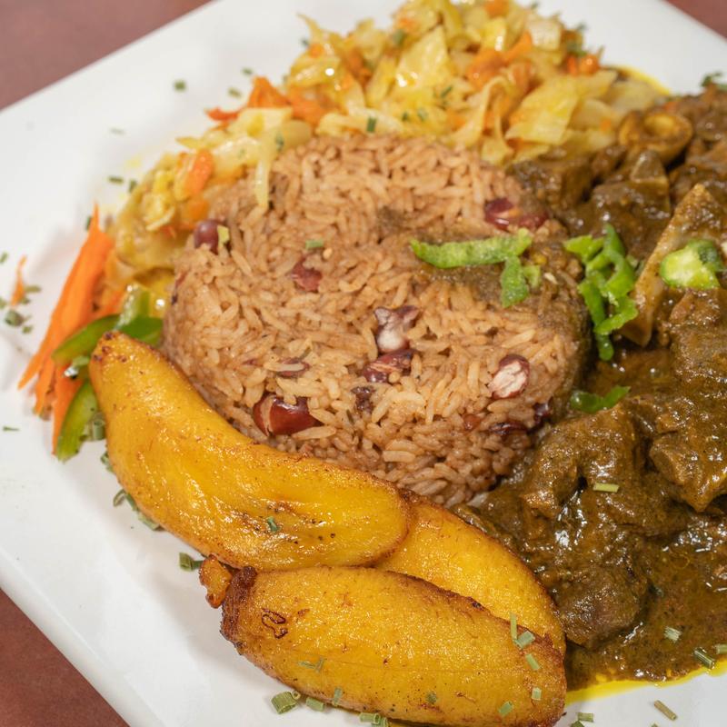 Curry Goat & Choose Two Sides: Steamed White Rice, Rice & Peas, Steamed Cabbage, Sweet Fried Plantain, or Baked Mac & Cheese