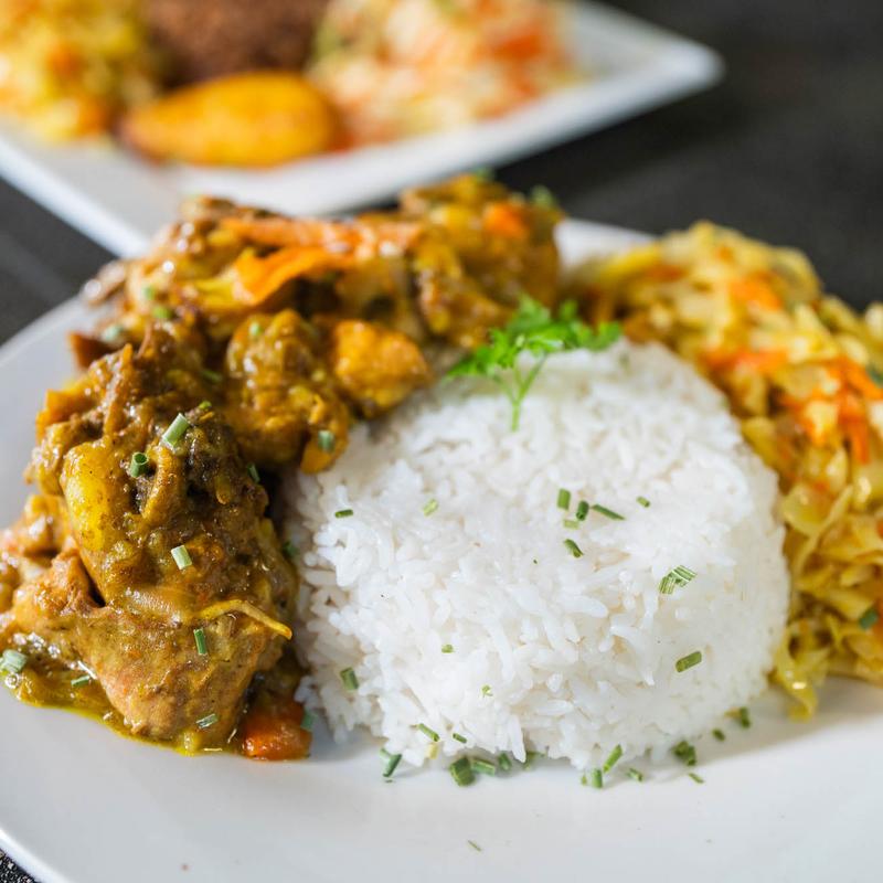 Curry Chicken & Choose Two Sides: Steamed White Rice, Rice & Peas, Steamed Cabbage, Sweet Fried Plantain, or Baked Mac & Cheese